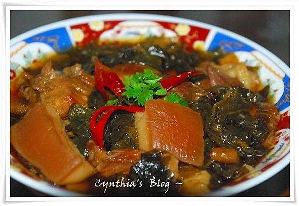 3.取一鍋放入肉塊和調味料 , 再擺上梅乾菜放入電鍋