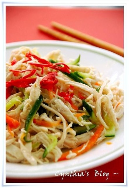 2.雞肉絲放入碗裡 + 胡蘿蔔絲 + 小黃瓜絲 + 調味料拌勻